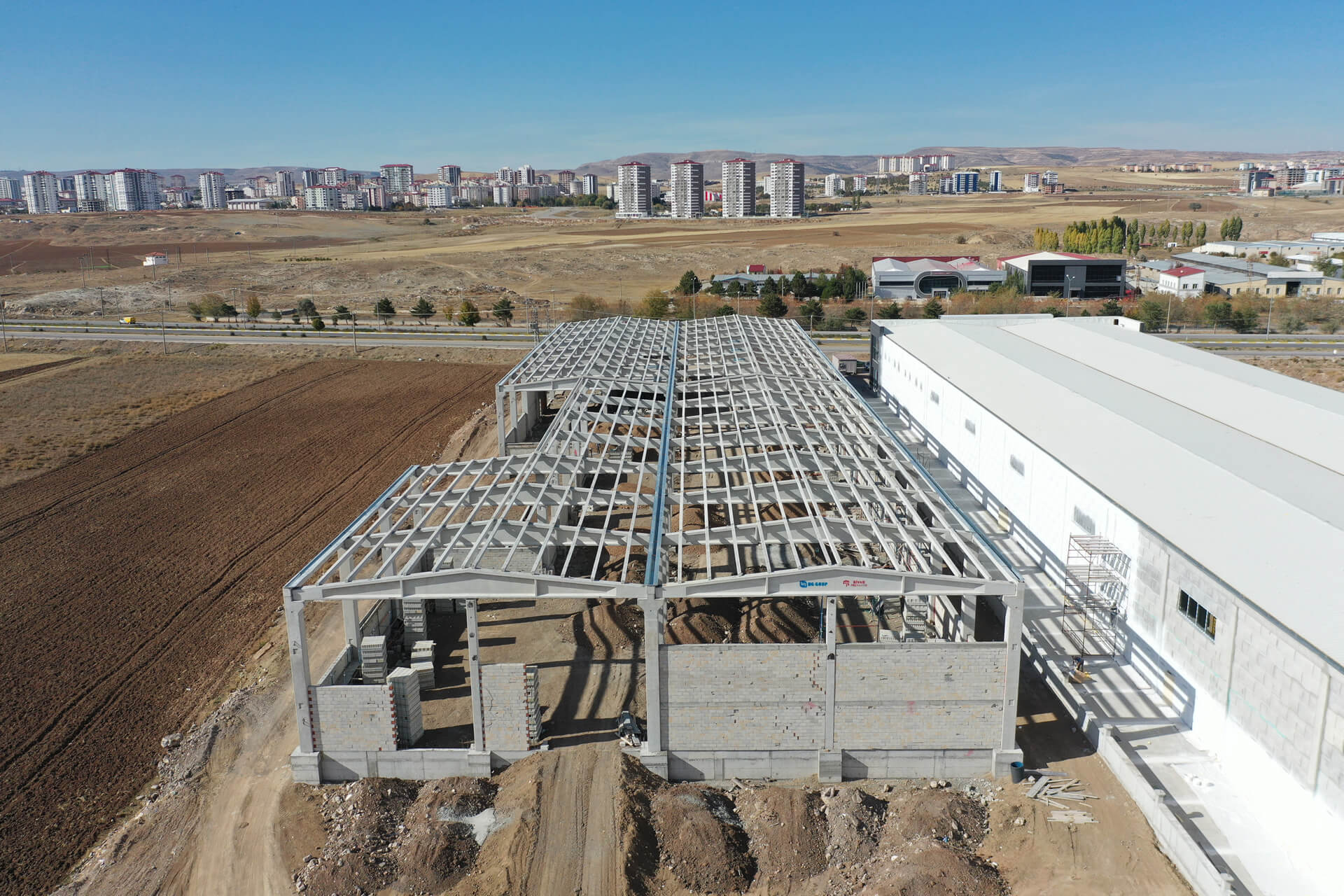 Kayacı Gıda Sivas 1. OSB’de iki holde toplamda 4650 m² inşaat alanı olacak şekilde planlamıştır. Yapının orta kısımlarında yer alan sundurma kirişleri sayesinde bina ortasında iki makas arası, dört aks uzunluğunda mimariye uygun galeri boşluğu bırakılmıştır. Sundurma kirişi tepe ve dere noktasında betonarme prefabrik yağmur oluğu yapılmıştır. Fabrikanın idari bina ara kat alanı 640 m2 betonarme prefabrik ara kat olarak tasarmış, toplam kullanım yaklaşık 4950 m²’ye çıkmıştır. Fabrikamızda üretilen prekast elamanların mevcut soketlere montajı 2022 yılında tamamlanmıştır.